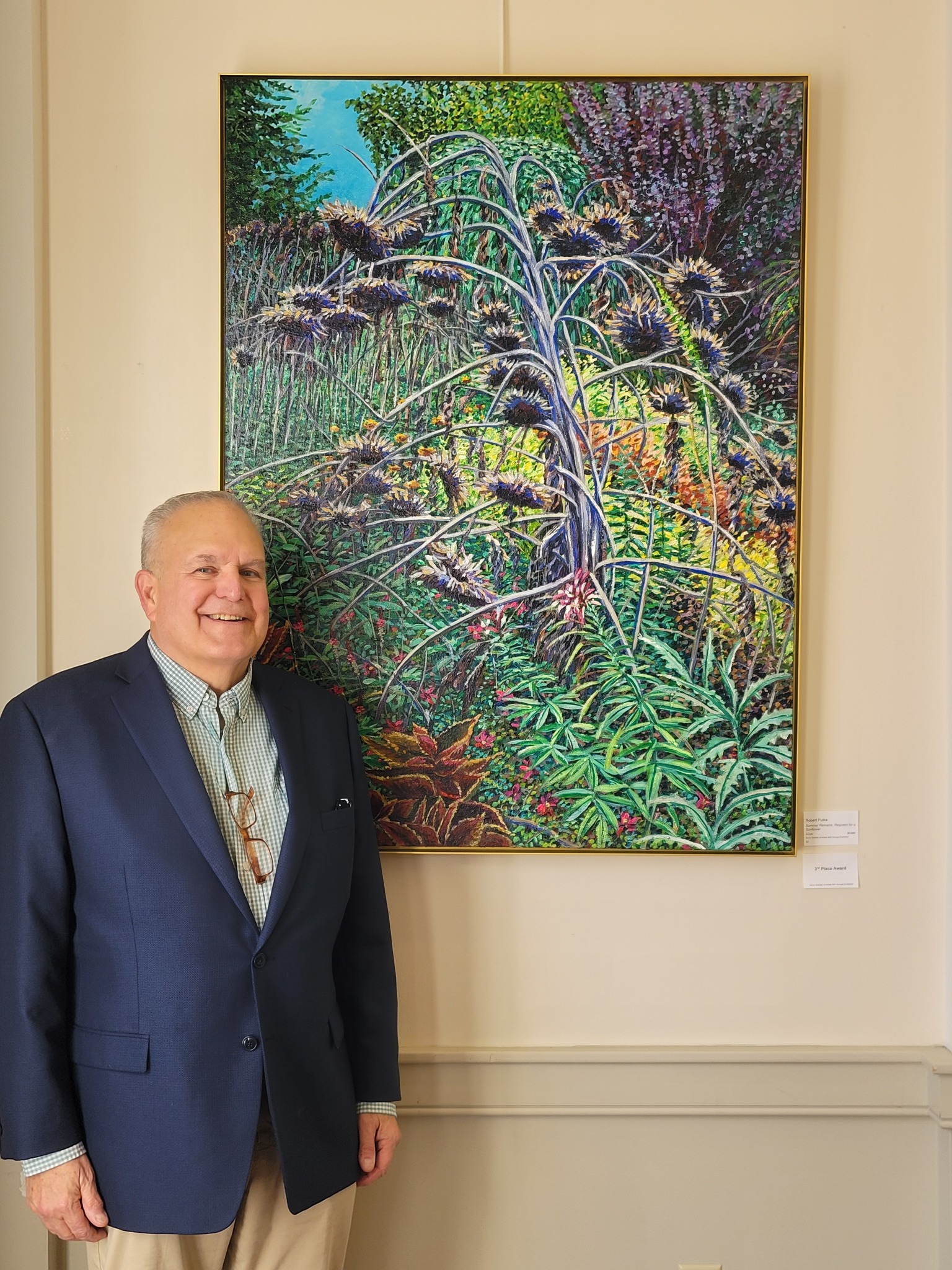Juror Comments: “The success of this painting is derived from the accomplished joyful control of light and saturated color. Photo realism demands care with every particular and this composition meets that task with conviction.”
